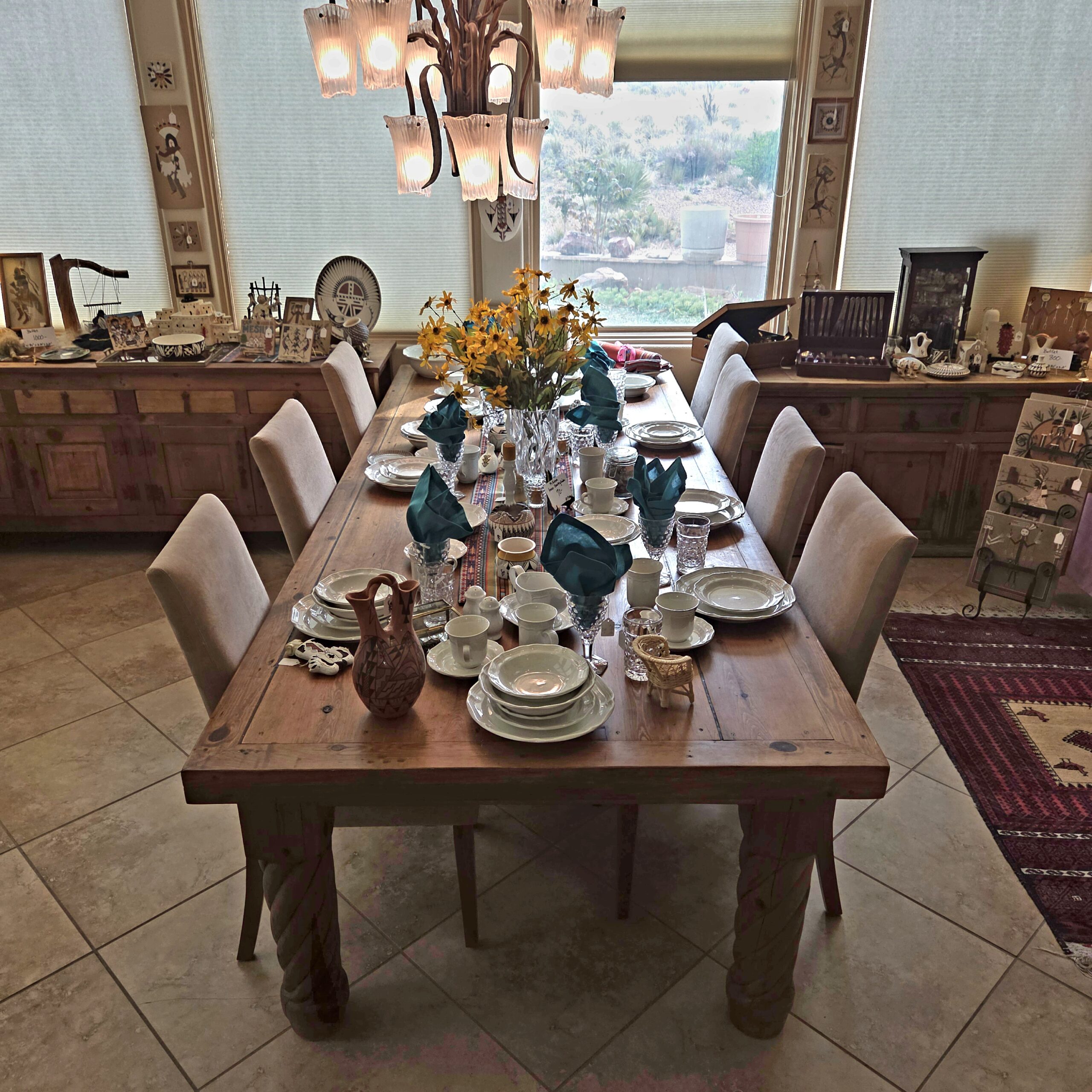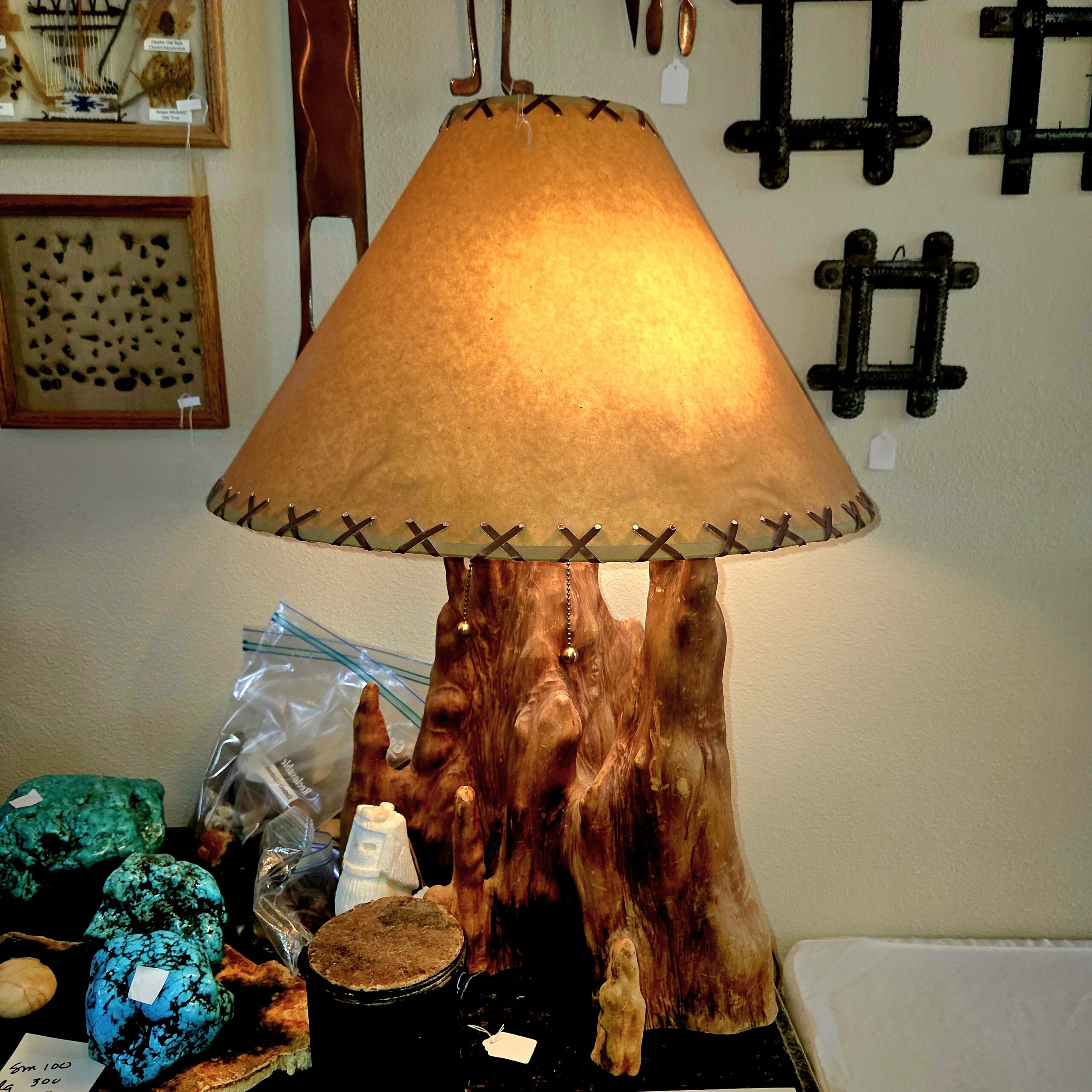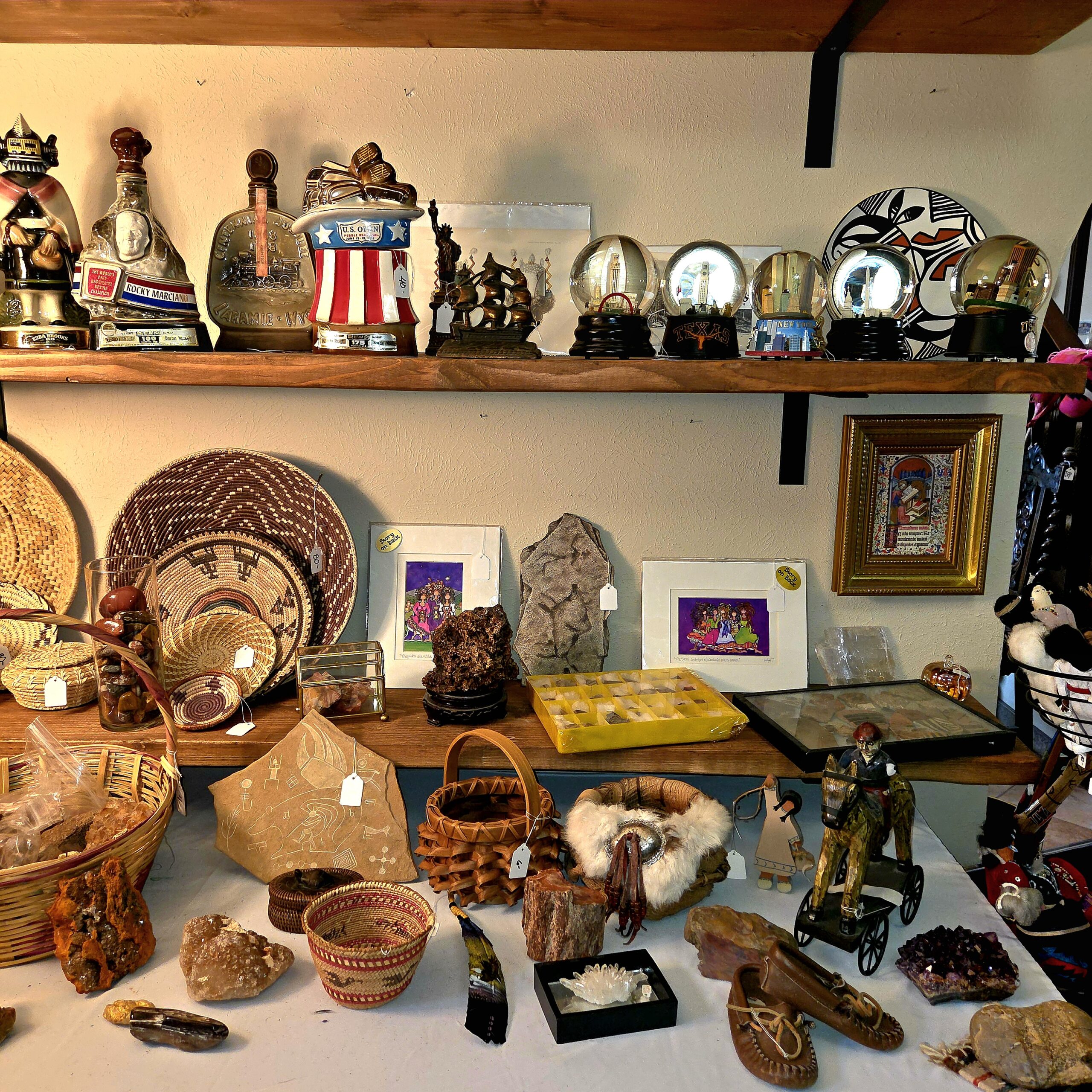 We’ve got animal mounts keeping an eye on things, and Native American artwork that isn’t just a collection—it’s practically a museum. Wall art, kachinas, pottery, rugs… not a handful, not a dozen, but a few HUNDRED. Colored glass, clear glass, porcelain teacups and full tea sets for when you suddenly decide to become classy, lamps for every mood, boxing gloves and equipment in case shopping turns competitive, tools, a generator, and enough rocks to start your very own quarry (seriously… you could branch out into the gravel business by Monday).