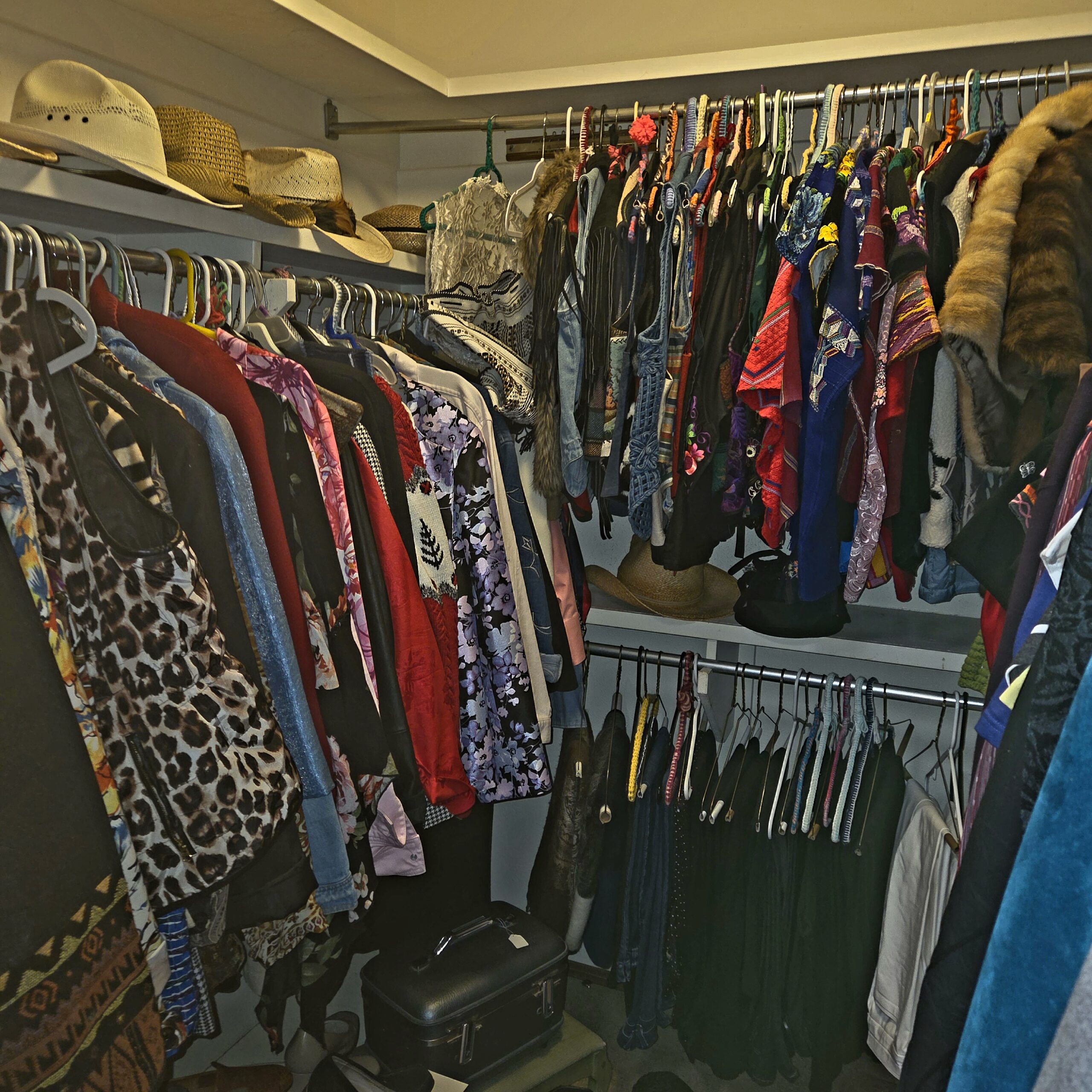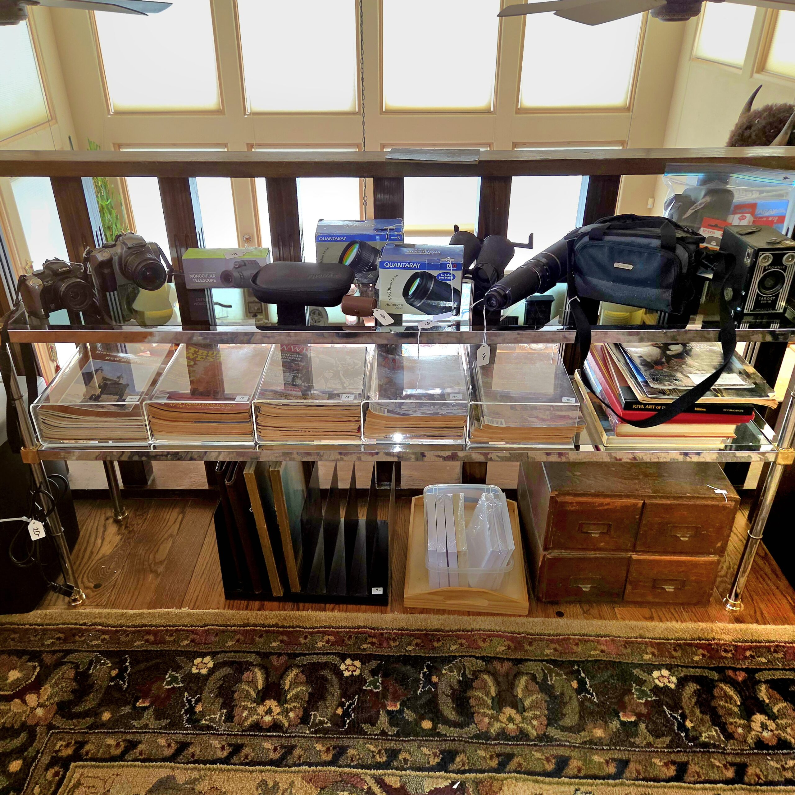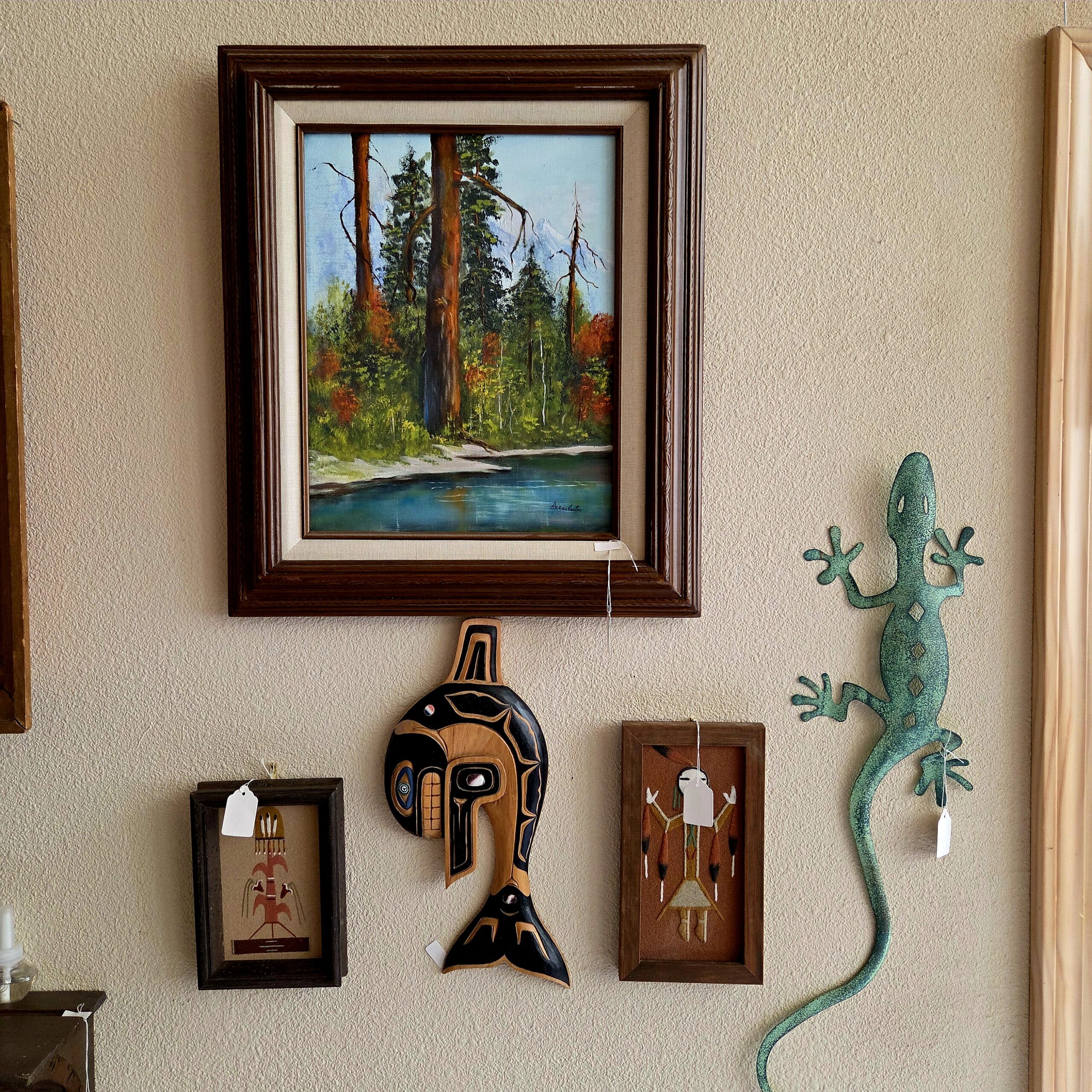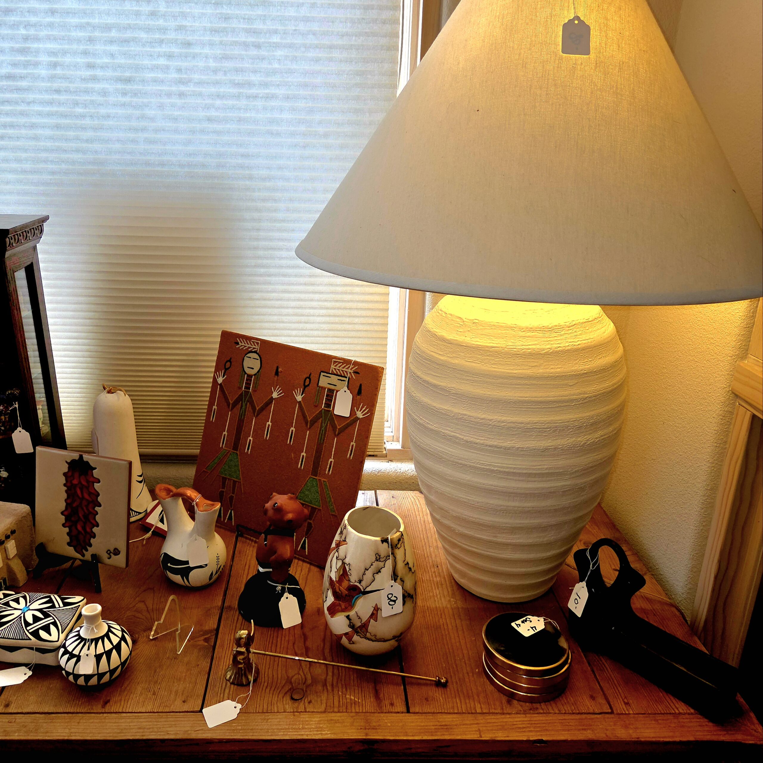 We’ve got animal mounts keeping an eye on things, and Native American artwork that isn’t just a collection—it’s practically a museum. Wall art, kachinas, pottery, rugs… not a handful, not a dozen, but a few HUNDRED. Colored glass, clear glass, porcelain teacups and full tea sets for when you suddenly decide to become classy, lamps for every mood, boxing gloves and equipment in case shopping turns competitive, tools, a generator, and enough rocks to start your very own quarry (seriously… you could branch out into the gravel business by Monday).